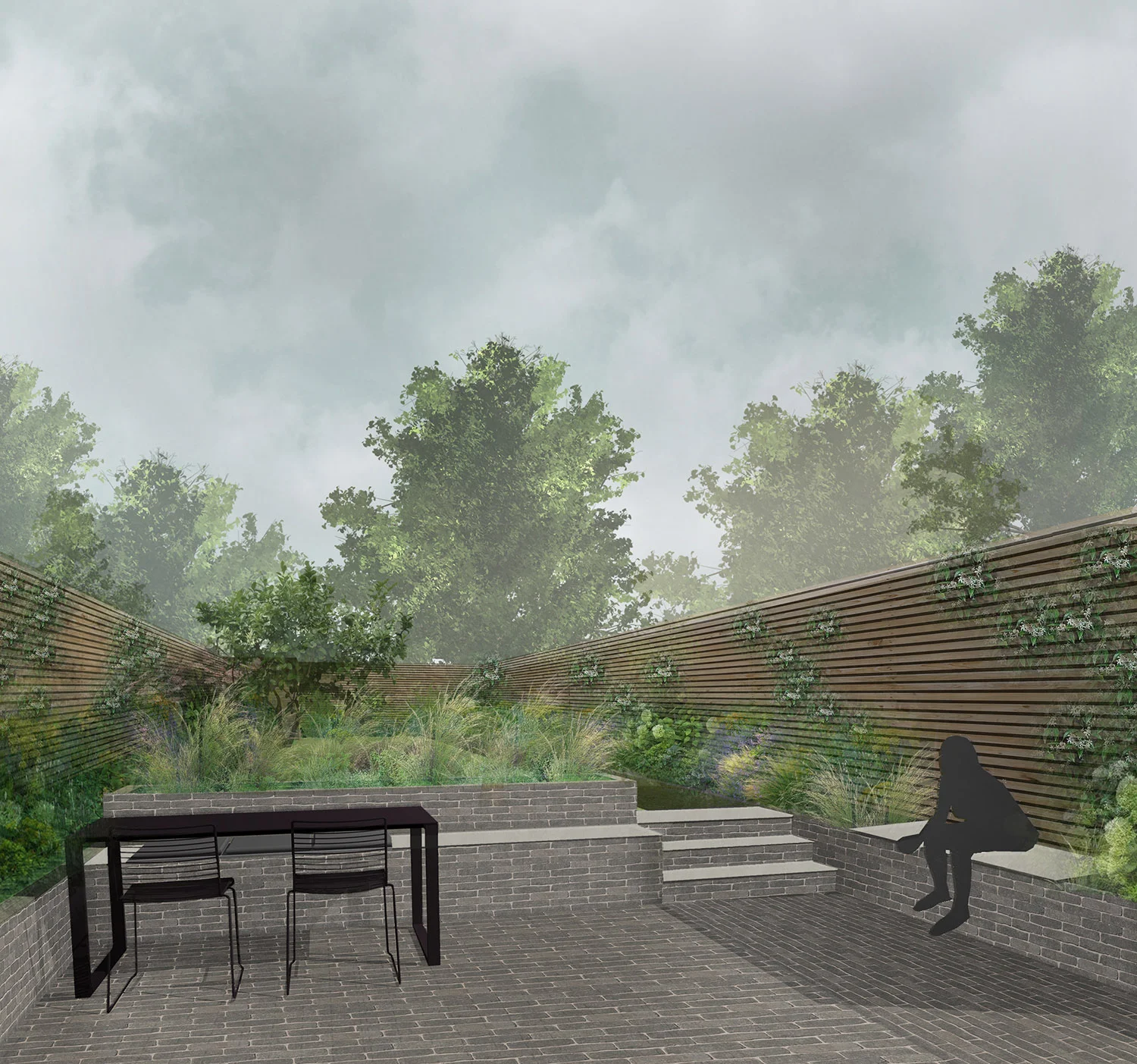 A rear garden to complement a contemporary renovation to a terraced house in Muswell Hill. The design includes a generous lawn and flexible hard landscaped space with porcelain topped seating which matches the interior floor finish. Proposed planting includes Stipa gigantea, Gaura lindheimeri and Stipa tenuissima.
